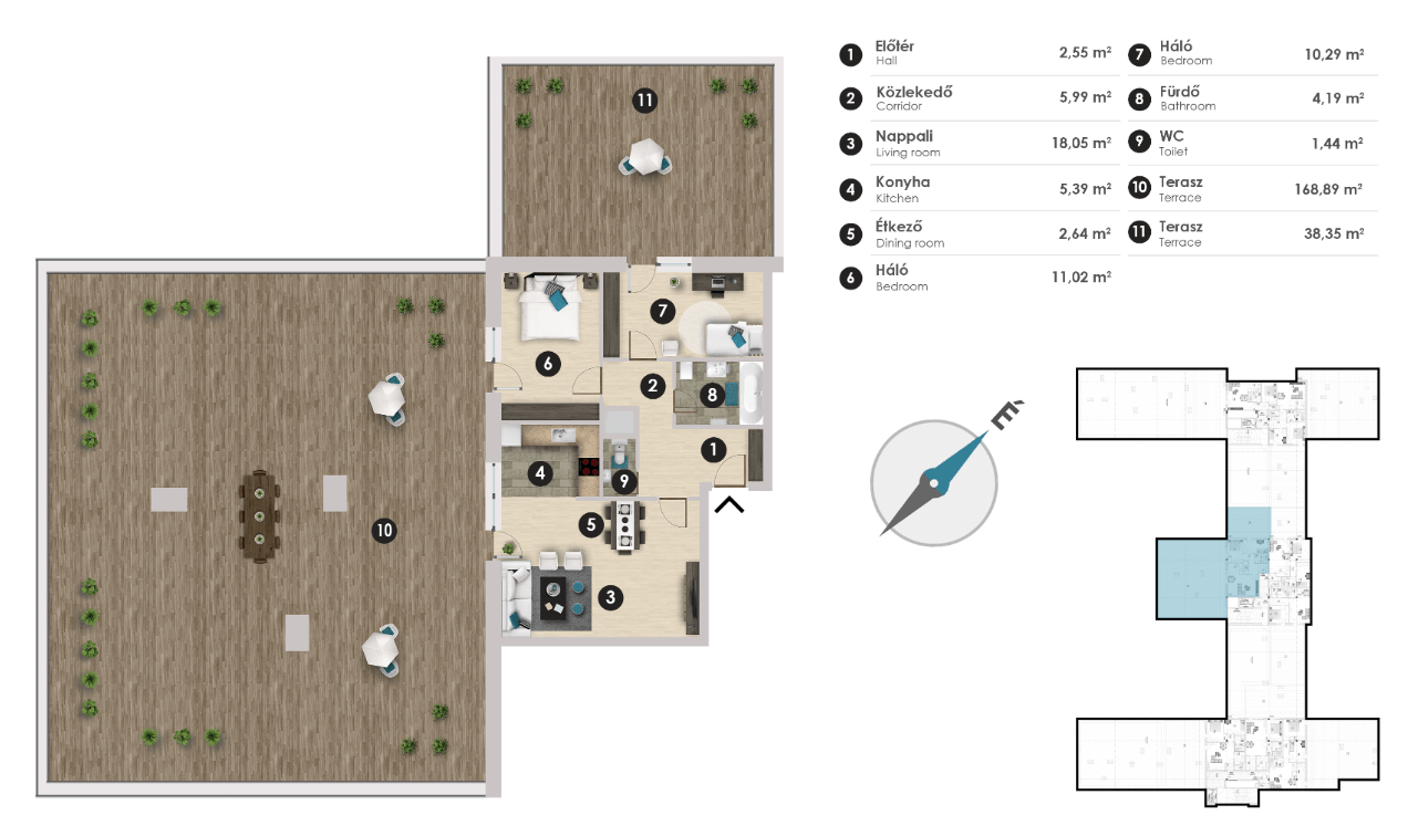 LAKJON A VÁROS FELETT – FIATALOK FIGYELEM! A PARK WEST 2 projektben eladó egy LEGJOBB ADOTTSÁGÚ PENTHOUSE, amelynek KULCSELEME a 169 NM-ES, KÖRPANORÁMÁS TERASZ. Nappali + 2 hálós elrendezés, minden szobából közvetlen TERASZKAPCSOLAT – RITKA LEHETŐSÉG annak, aki FUNKCIONÁLIS ELRENDEZÉST és MAXIMÁLIS KÜLTÉRI ÉLETTERET keres.